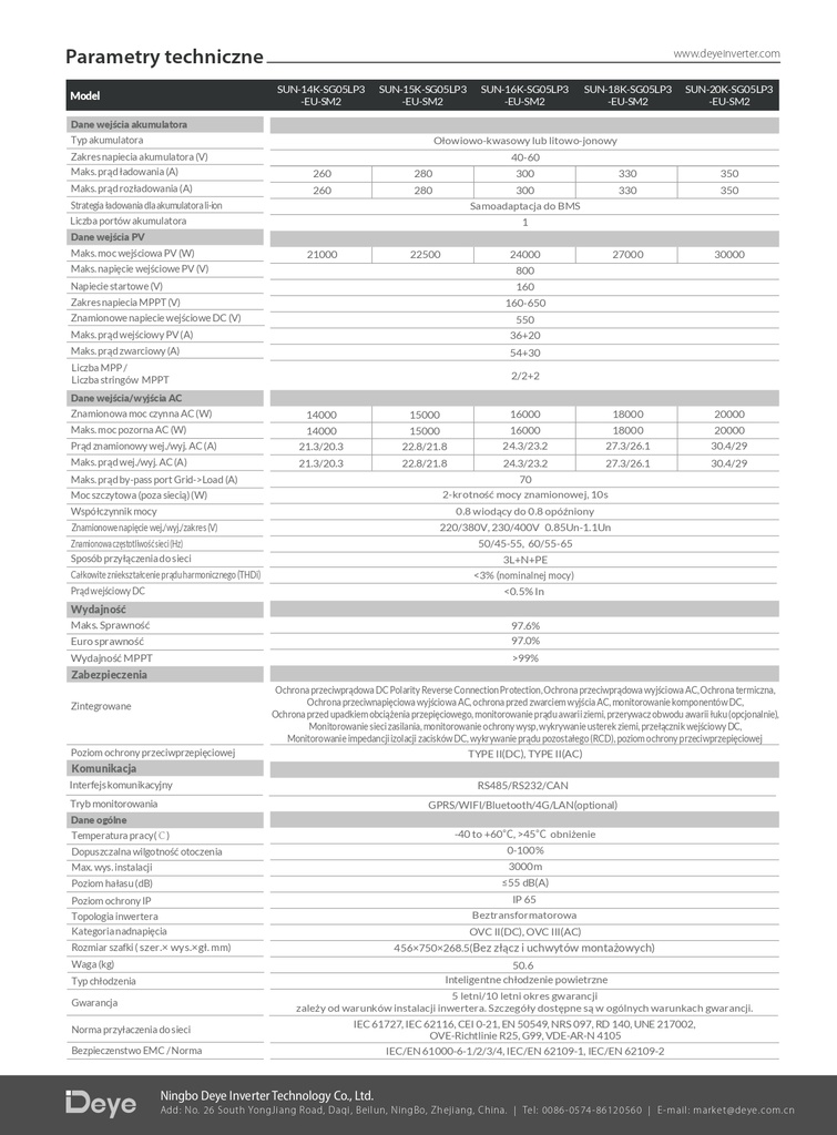 Deye SUN-20K-SG05LP3-EU-SM2, trójfazowy falownik hybrydowy, 48V